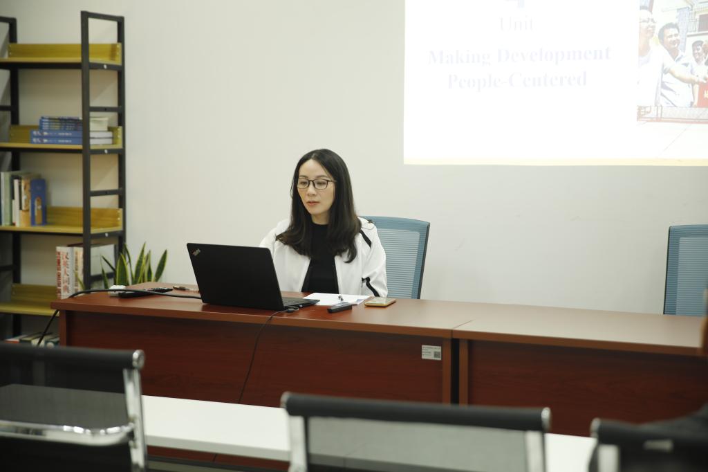陈果老师分享的“《理解当代中国英语演讲教程》第四单元:以人民为中心的发展思想”思政案例,从课程描述、单元教学内容及思政育人目标、单元思政教学设计、教学设计反思和补充思政教学资源五个方面介绍了单元思政教学设计方案。通过课前(分工合作完成预习任务)、课中(小组汇报分享学习成果)和课后(个人演讲巩固所学重点)三个阶段的设计与实践,从分项输入到融合输出,达成理解当代中国、讲好中国故事的教学和思政育人目标。